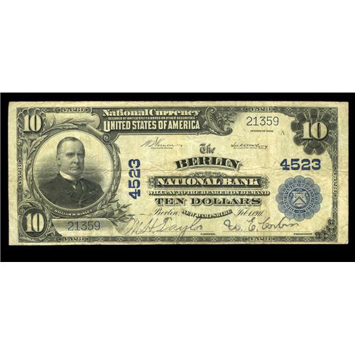 <B>Berlin, NH</B></I> - $10 1902 Plain Back Fr. 627 <B>The Berlin NB</B></I> Ch. # 4523<BR>While small notes are often available from here, large examples are very much more scarce, with just over a dozen of all types and denominations listed in the census. <B>Fine-Very Fine,</B></I> with clear signatures.