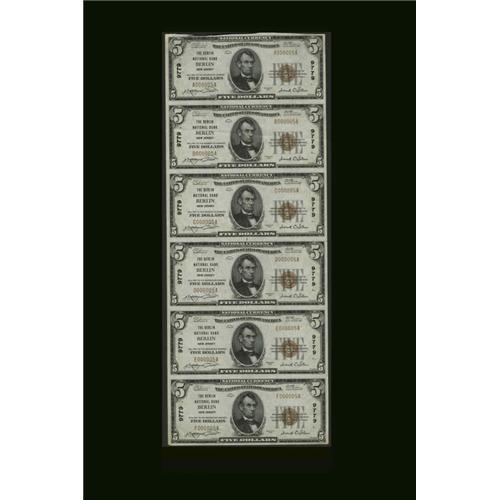<B>Berlin, NJ</B></I> - $5 1929 Ty. 1 <B>The Berlin NB</B></I> Ch. # 9779 Uncut Sheet<BR>An attractive Type 1 sheet with each note bearing serial number 5. The top margin is trimmed in and somewhat irregular, there are corner folds at the bottom, and one of the notes has a light fold through it, but the notes are otherwise <B>Uncirculated</B></I> and the sheet is attractive despite its minor faults.