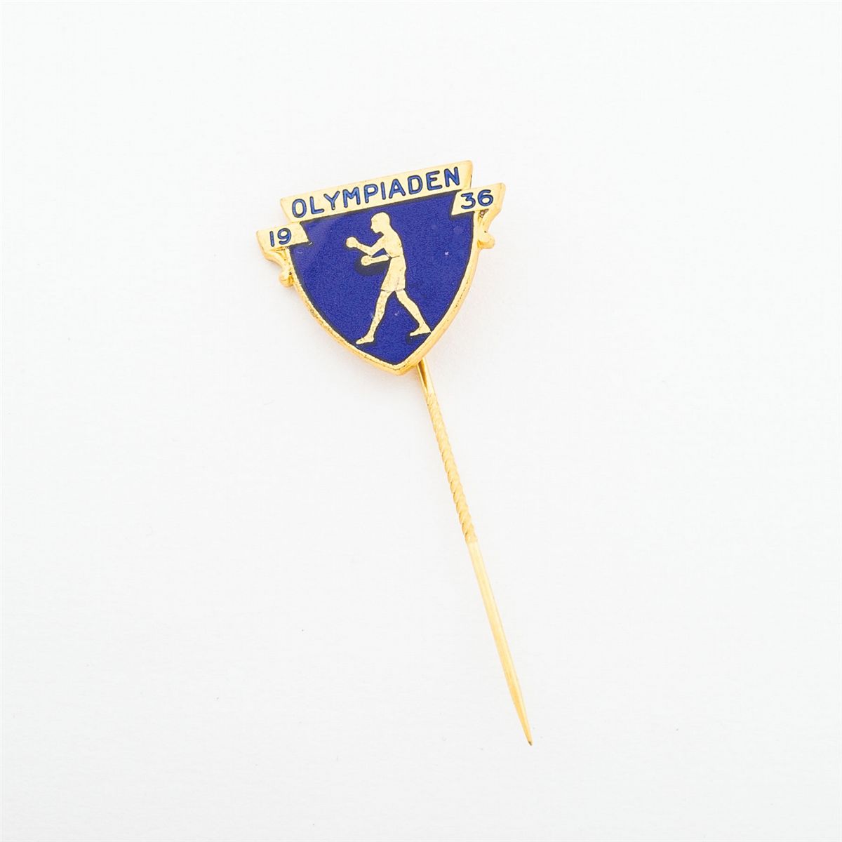 Original 1936 Summer Olympic boxing stick pin. Pin measures 2? long, with a gold image of a boxer, and “Olympiaden 1936,” across the top. Most likely a pin for the Swedish Boxing Team. Reverse of the pin is stamped, “Sporrongace, Stockholm.” In fine condition.