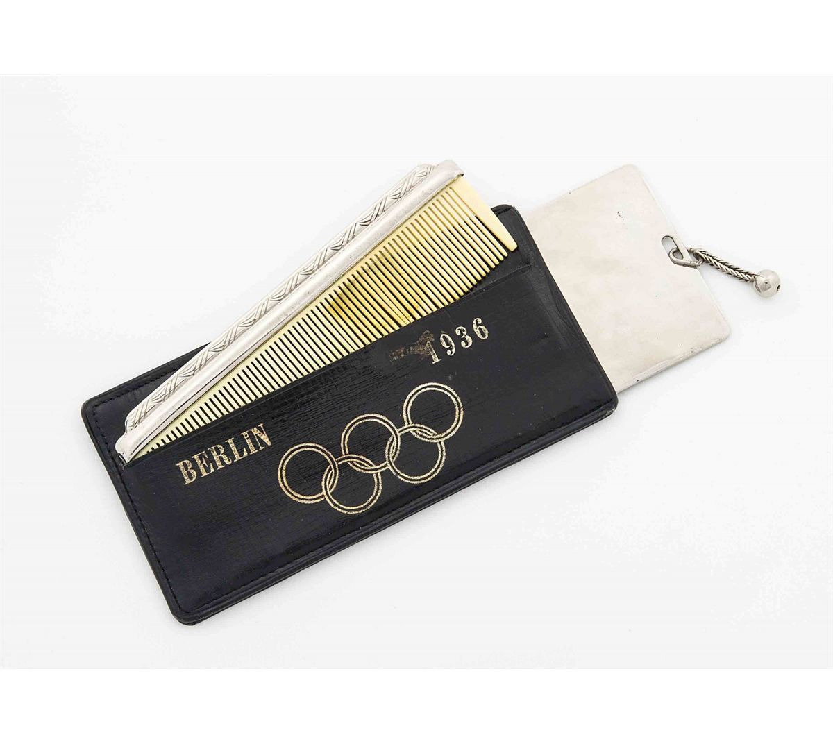 Original hair comb from the 1936 Summer Olympics held in Berlin, Germany. Ivory-colored comb measures 4.5? long, with a silver-plated handle. Comb comes (unexpectedly) in its original leather case with the Olympic rings and “Berlin 1936,” printed in gold on one side. In fine condition, with some very light wear to case.
