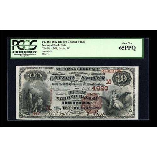 <B>Berlin, WI</B></I> - $10 1882 Brown Back Fr. 485 <B>The First NB</B></I> Ch. # (M)4620<BR> A gorgeous Brown Back with everything a collector could desire. From the generous margins to the fresh and original paper quality to the vivid colors and bold pen signatures, this note has it all. If you are searching for just one Wisconsin Brown Back for your state or type set, this is a note you will never have to upgrade. <B>PCGS Gem New 65PPQ</B></I>.<BR><BR><b>Shipping:</b> Coins & Currency (<a target="_blank" href="http://www.heritageauctions.com/common/shipping.php">view shipping information</a>)