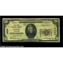 Berlin, WI - $20 1929 Ty. 1 The First NB Ch. # 4620Only small example from here in this collection. Very Good-Fine. Important notice: Heritage usually auctions material at the rate of 200-250 lots per hour. On some occasions eBay Live bid software or the Internet may not be able to keep up with the pace of the auction. We recommend placing a realistic absentee bid now as insurance to avoid disappointment. Occasionally the auctioneer may eliminate or reject an eBay Live bid, and the auctioneer may also reopen a lot after the close of the eBay live bidding (usually because we missed an audience bid), and may reject your bid even if it shows you as the winning bidder. By bidding via eBay Live, you agree that Heritage may award the lot to another bidder at its sole discretion under the circumstances described above or any other reasonable circumstances. Also please note that all Heritage lots purchased through eBay Live carry a 20% Buyer's Premium. Please make sure you read the Terms and Conditions before you bid.