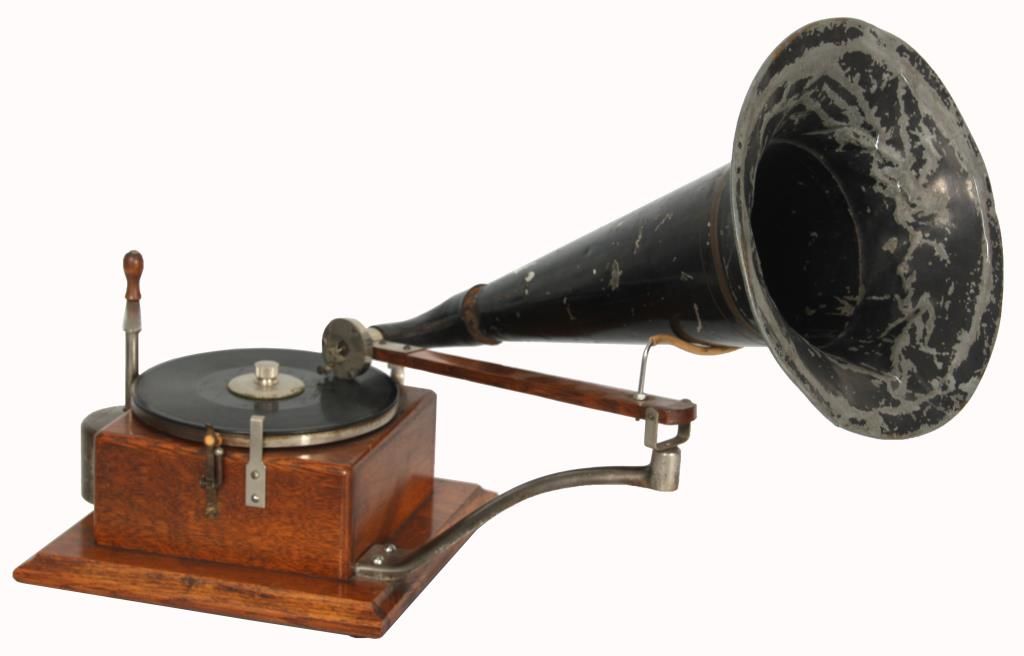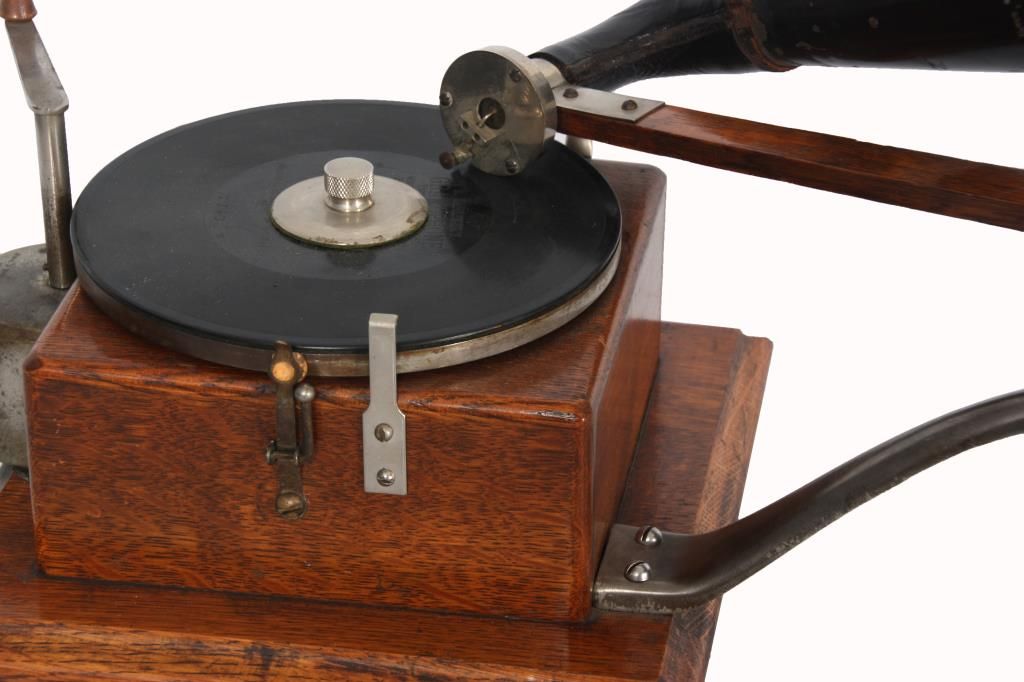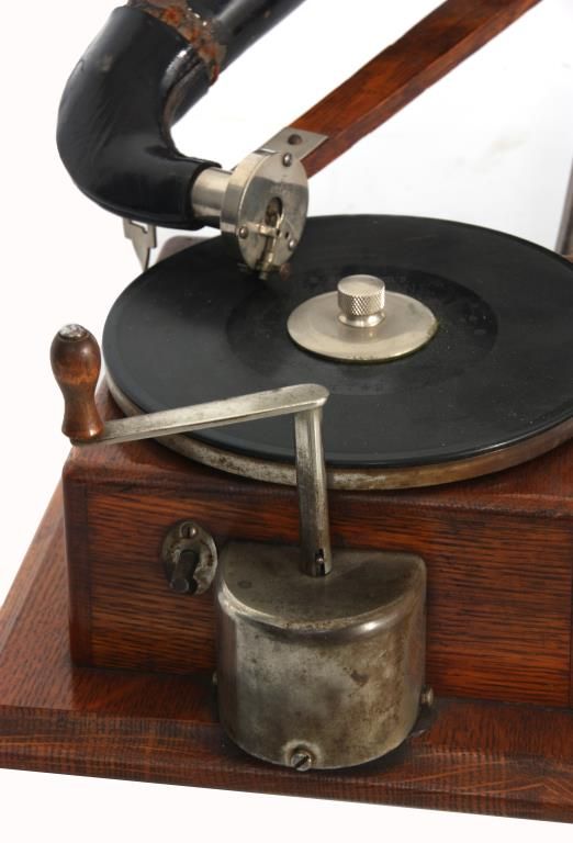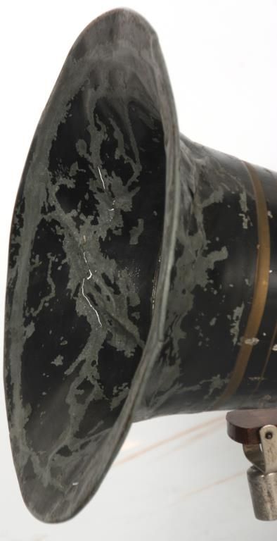 Berliner Model J Gramophone. Oak case has a 7 in. turntable, spring driven with external spring encased on the right side and crank arm winding from the top; steel support arm on the side with oak stick tone arm with model “J” reproducer, numbered 25549 with leather fitting feeding into the painted black bell-shaped horn, 14 in. long x 10 in. dia. Decal reads “Berliner Gramophone, National Gramophone Co., New York City”. In good overall condition, horn has some scratches, paint wear and dings; model “J” and serial number 13390. Overall dimensions 16 in. high x 22 in. wide, case is 10 in. square.