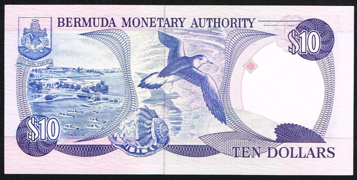 Purple, blue and ochre on multicolor underprint,Mature bust of Queen Elizabeth II at right. Signature titles: CHAIRMAN and DIRECTOR.Back:Bermuda Petrel and seashell at the center, beach at left, arms at upper left.Watermark:Tuna fish (Low Serial)