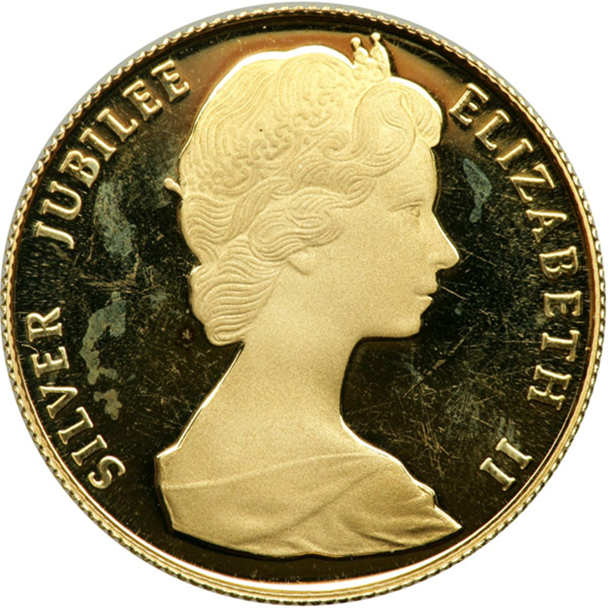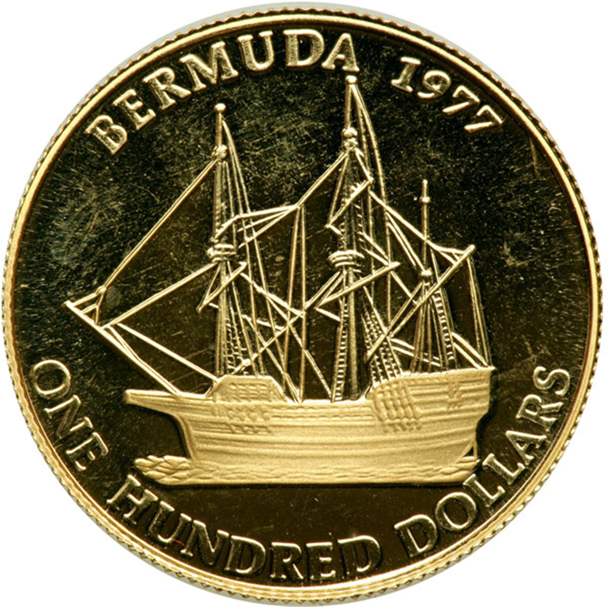 Bermuda. 100 Dollars, 1977. KM-27. Weight 0.2344 ounce. Queen's Silver Jubilee. Sailing ship Deliverance. With original blue case. Choice Brilliant Proof.