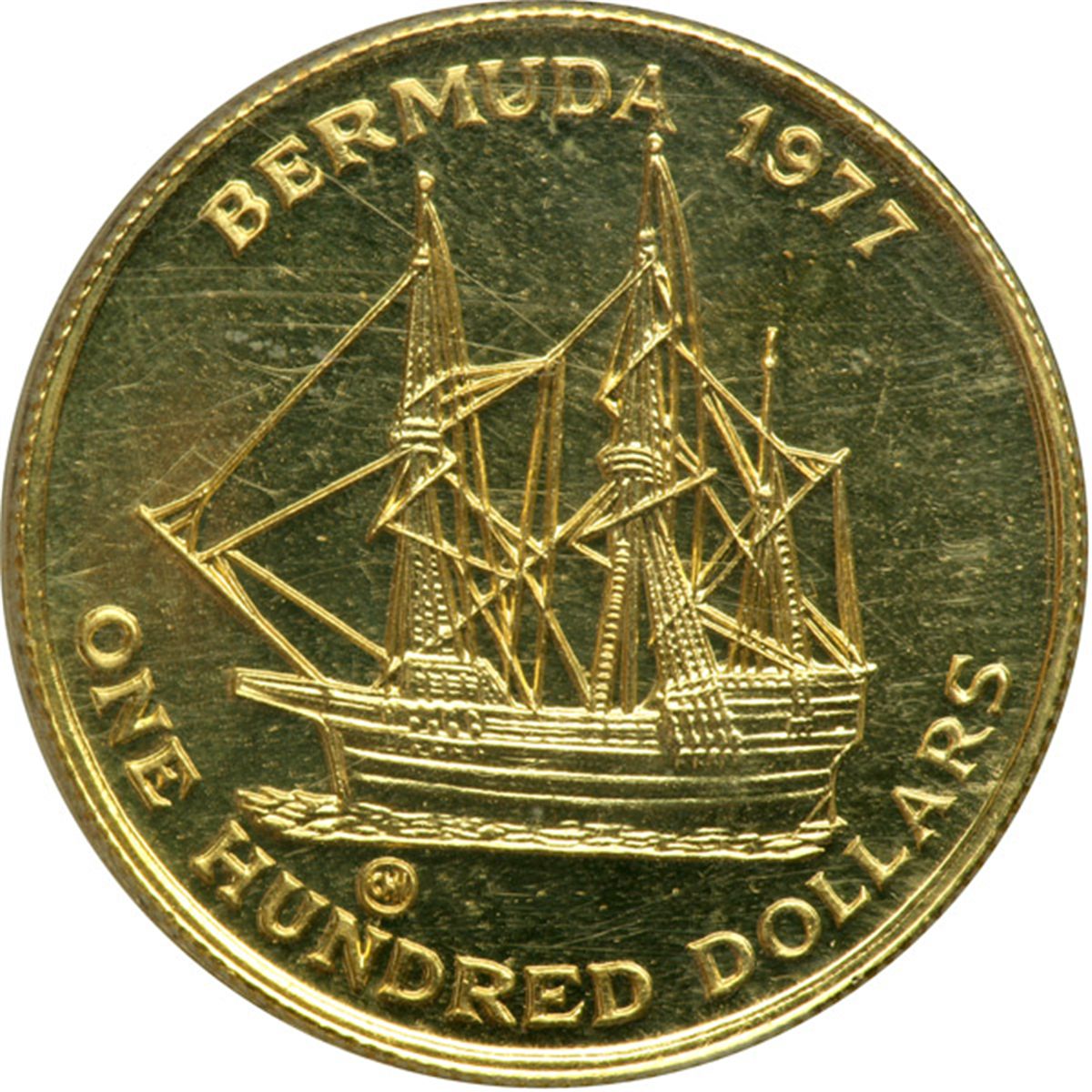 Bermuda. 100 Dollars, 1977. Fr-3; KM-27. Weight 0.2344 ounce. Ship "Deliverance". In original holder. Uncirculated.