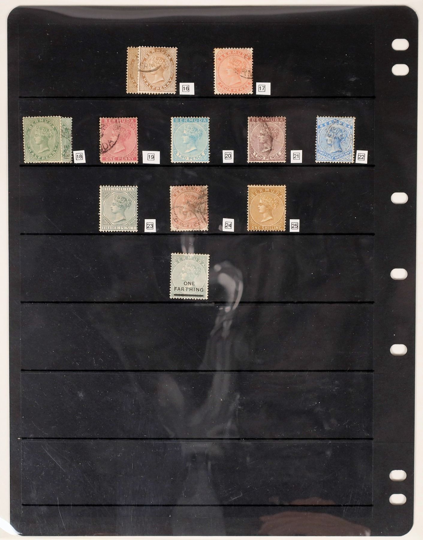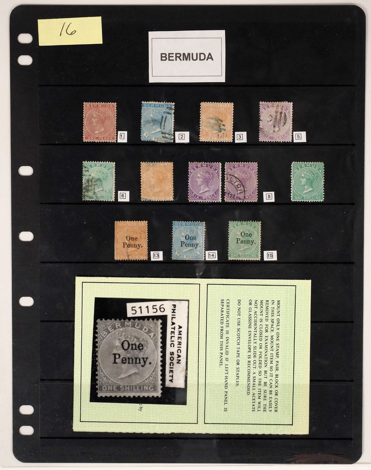 Bermuda. 1865-1904 Victoria issues. Scott #1//25, substantially complete (21 different), best items 1875 Surcharges unused (Scott #13-5, 1p/3d used with straight edge, 1p/1s APS certificate), owner's 2005 catalog value $1,813, Nice appearance, please see scans.