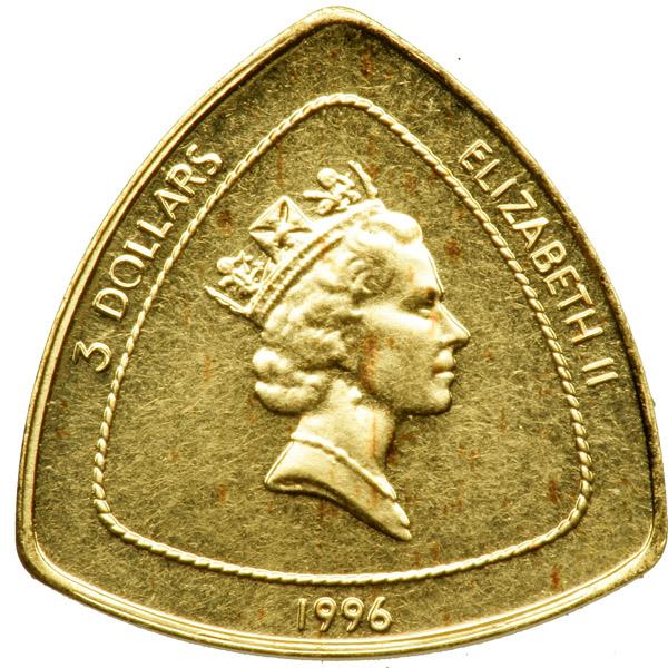 Bermuda. 3 Dollar, 1996. Fr-29a. Weight 0.0499 ounce. Elizabeth II. Reverse: Map, compass, capsizing ship. Brilliant Uncirculated.