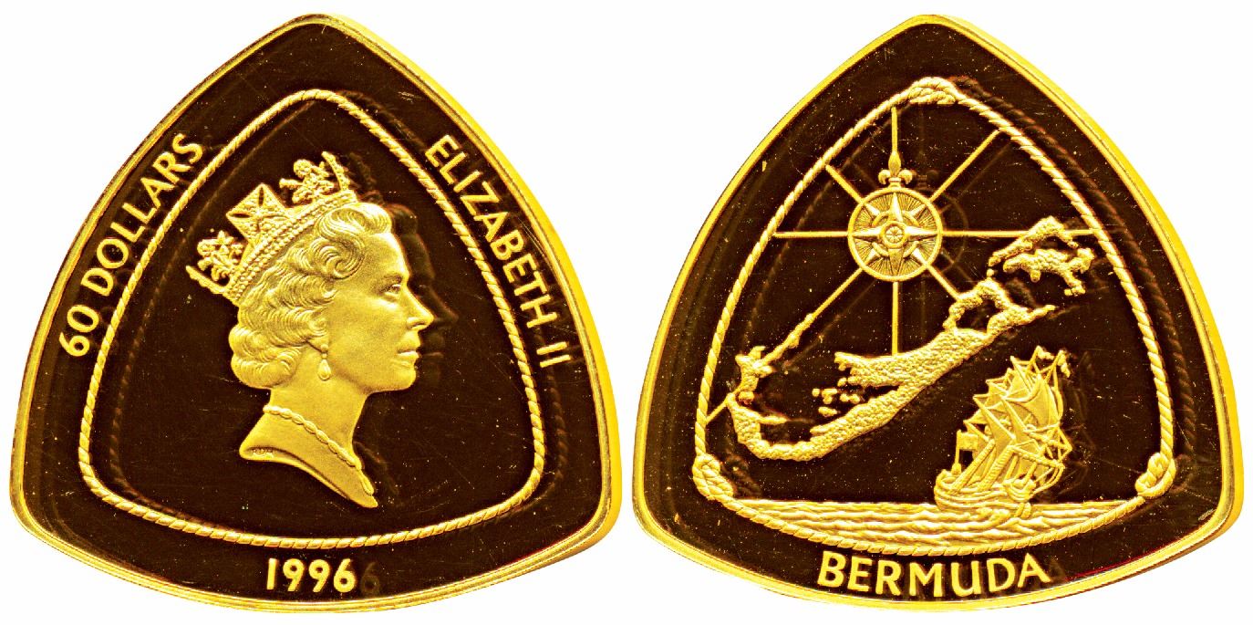 Bermuda, Elizabeth II, Gold Proof Triangle $60, 31.48g, .999 fine, 1996, a map of the islands of Bermuda, compass and capsizing ship on rev. a Limited issue of 1500 pieces only. Proof, in original triangular box of issue, Rare.