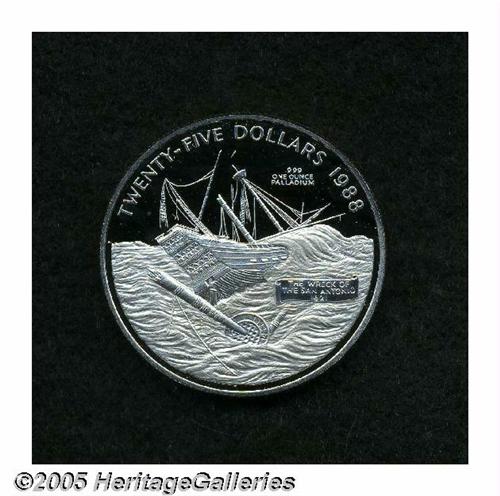 <B>Elizabeth II palladium 25 Dollars 1988, </B></I>KM63, choice Proof in the case of issue with certificate. Ship wreck of the San Antonio. One ounce pure, 2000 minted and catalog value $600. From the Dr. Kurt Peters Collection.