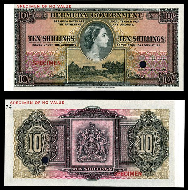 Bermuda, ND (ca. 1952-66),10/- Shillings, P-19cts, Unlisted Color Trial Specimen, black on m/c underprint instead of issued red on m/c, Queen Elizabeth II at right, back black and m/c with arms at center, Specimen overprints, POC's, “Specimen of No Value” on top left front and back margins, No Serial number on face, “74” on top left back corner. PMG graded Choice Uncirculated 64 NET with note of mounting remnants attached, BWC. Very possibly the only graded example in the PMG census.