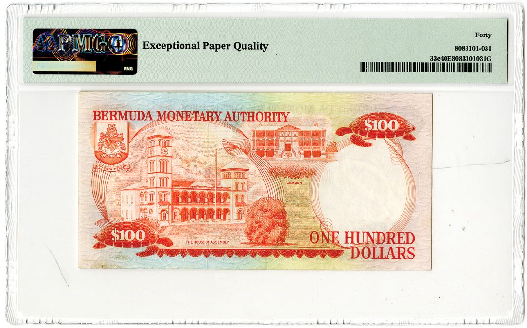 Bermuda. 1986. 100 Dollars, P-33c, Issued banknote, S/N A/1 214878, Watermark: Tuna Fish, PMG graded Extremely Fine 40 EPQ.