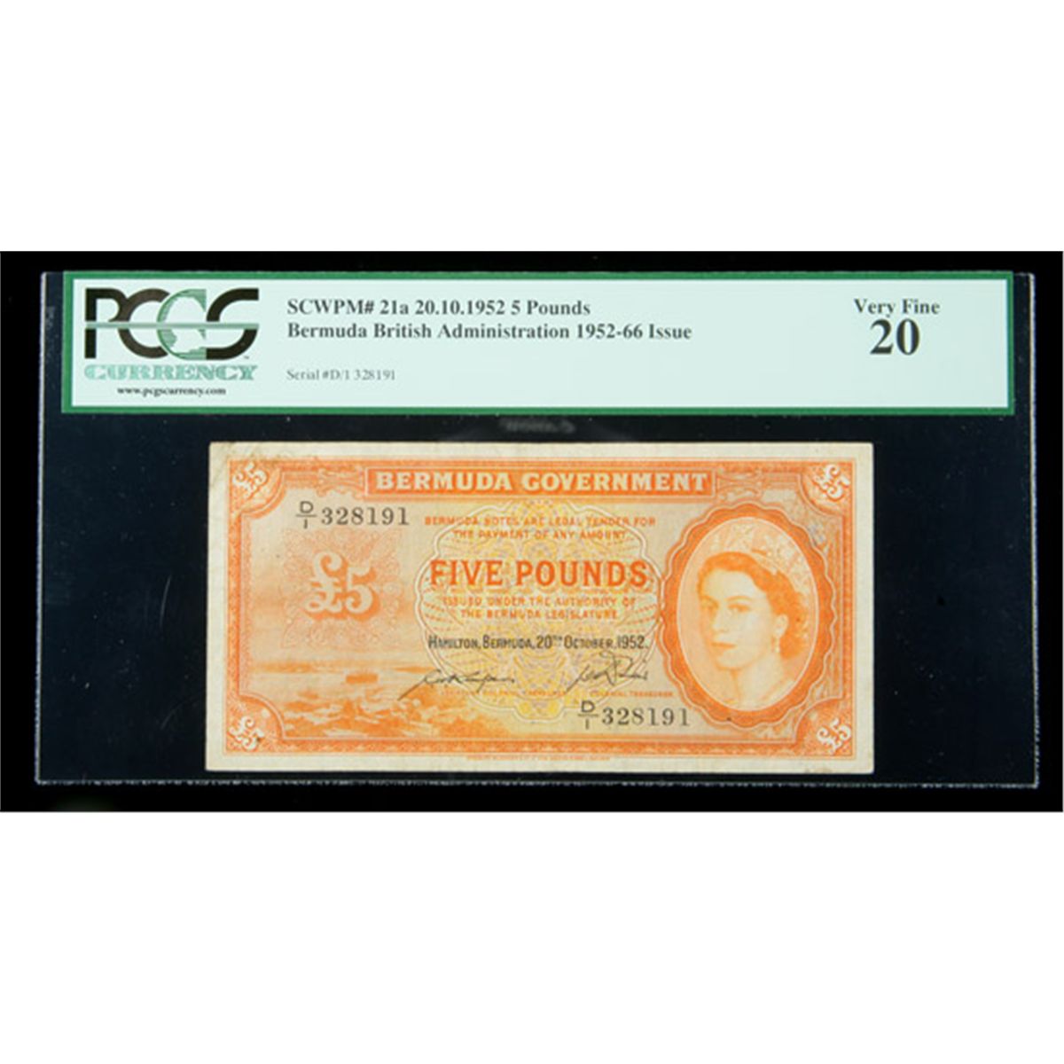 Bermuda SCWPM# 21a, 20.10.1952 5 Pounds. PCGS Very Fine 20. . Fr-P-21a. A solid mid-grade circulated example of the first Queen Elizabeth issue.