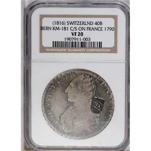 <B>Bern. 40 Batzen ND (1816), </B></I>KM181, VF20 NGC, bear in shield and 40 BZ. counterstamps on a French Ecu of 1790.