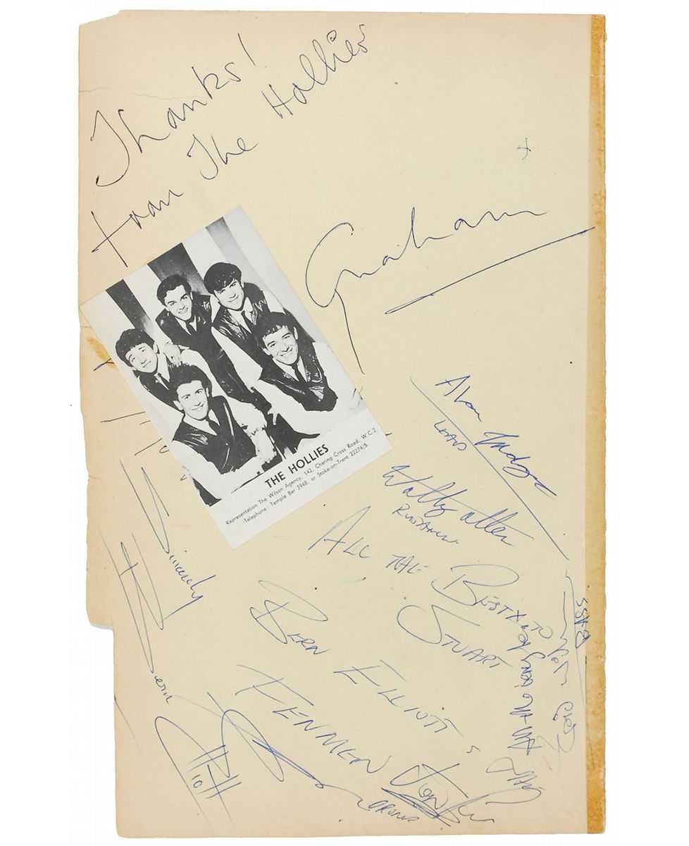 Vintage ballpoint signatures of Bern Elliott, Alan Judge, Wally Allen, Eric Willmer, and John Povey on a large 10 x 16 off-white album page, also signed by Graham Nash, with a small promotional photo of the Hollies affixed to the middle of the page. A thin strip of adhesive remnant along the right edge and a few edge creases, otherwise fine condition.