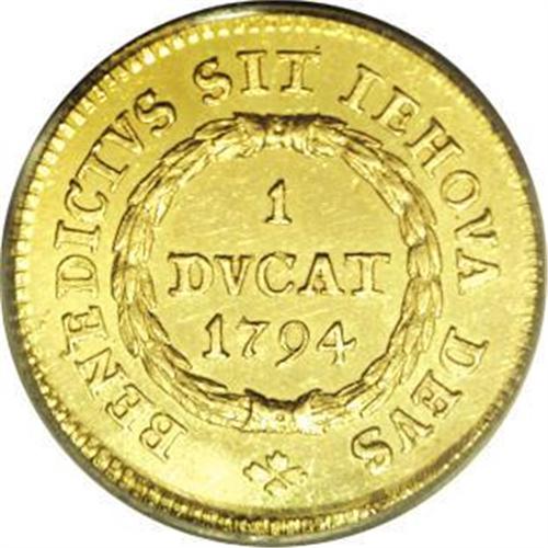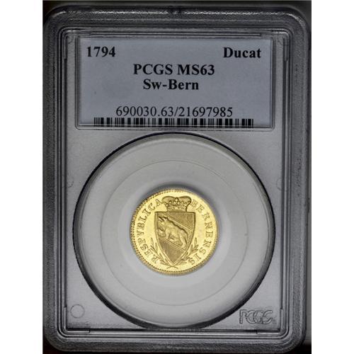 <B>Bern. Gold Ducat 1794, </B></I>KM148, MS63 PCGS, slightly prooflike surfaces, fully lustrous and very attractive.