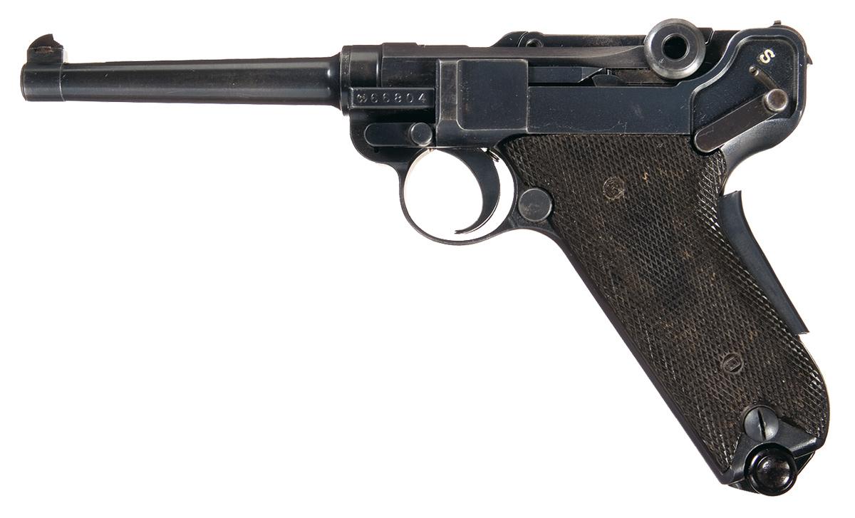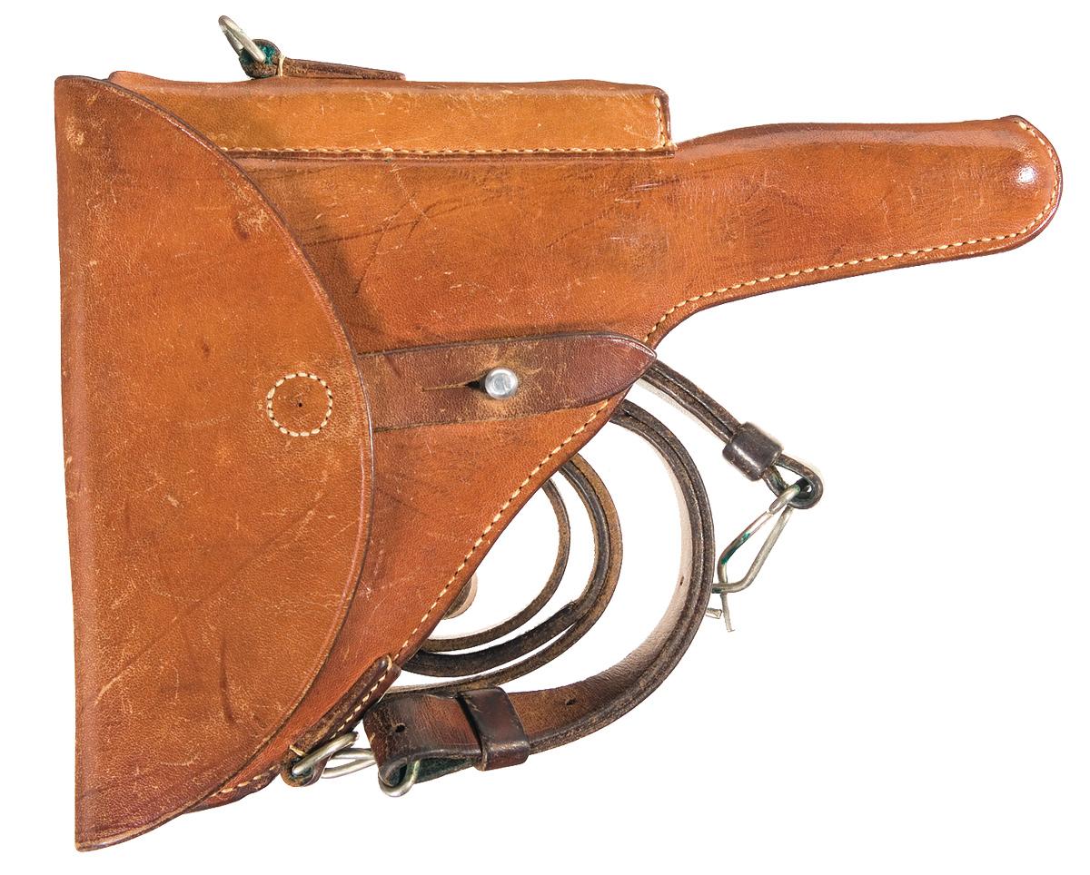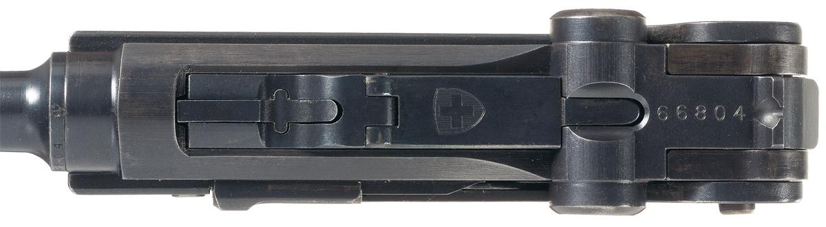 Fixed sights, with the serial number and conjoined "BP" stamp on the chamber and "Swiss Cross in shield" on the toggle link. Matching numbers on the frame, barrel and rear toggle. Bern "FW+" markings on several parts. Checkered black plastic grips and nickel finished magazine with plastic base. With a brown leather flap holster marked "O. PLUSS/ ZOFINGEN/ 43" on the rear, brown leather shoulder strap and a spare magazine.