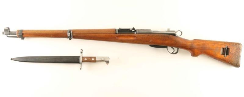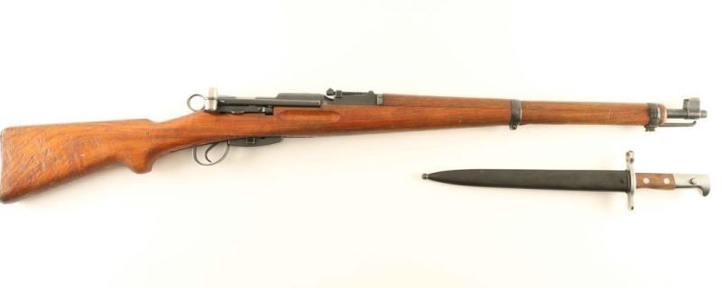 Swiss military magazine fed straight-pull bolt action service rifle chambered in 7.5x55mm, manufactured circa 1914-1933. Imported by C.A.I. of Georgia, V.T. with import marks on the receiver. Features a blued finish, 25.75" barrel, shrouded windage adjustable patridge front sight, leaf style rear sight graduated to 1,500 meters, two barrel bands with a stacking hook on the front band & sling swivel on the rear band, Elsener Schwyz 1918 bayonet with scabbard, smooth trigger, detachable 6 round magazine, cylindrical aluminum bolt handle, cocking ring, smooth wood handguard and full-length pistol grip shoulder stock with finger grooved forend, sling bar and smooth metal buttplate. Serial numbers match on the receiver, barrel, bolt, and magazine. Rifle exhibits approximately 70% of it's blued finish showing wear and thinning. Action is sound, the bore is excellent and the wood stocks are good with many blemishes. Condition is NRA Good to Very Good. ***C&R Firearm*** From The John F Sukey Collection