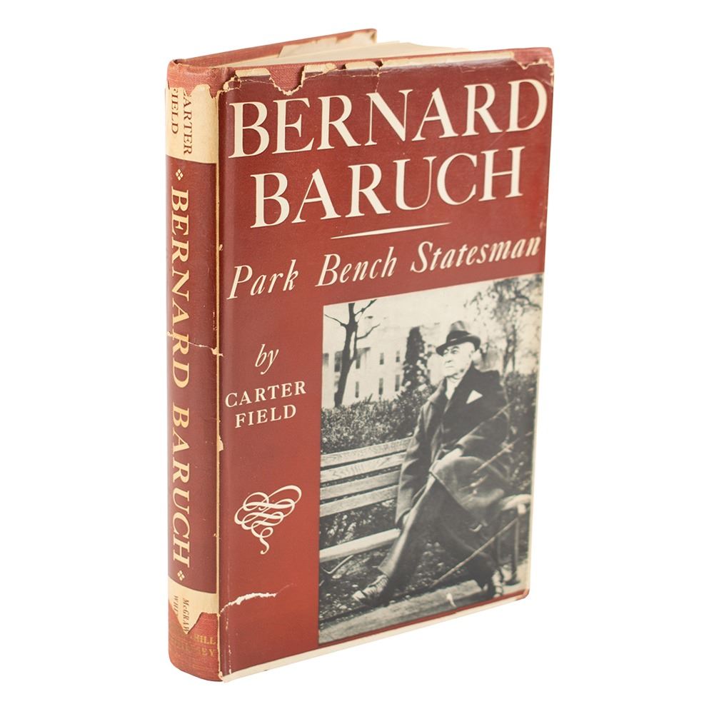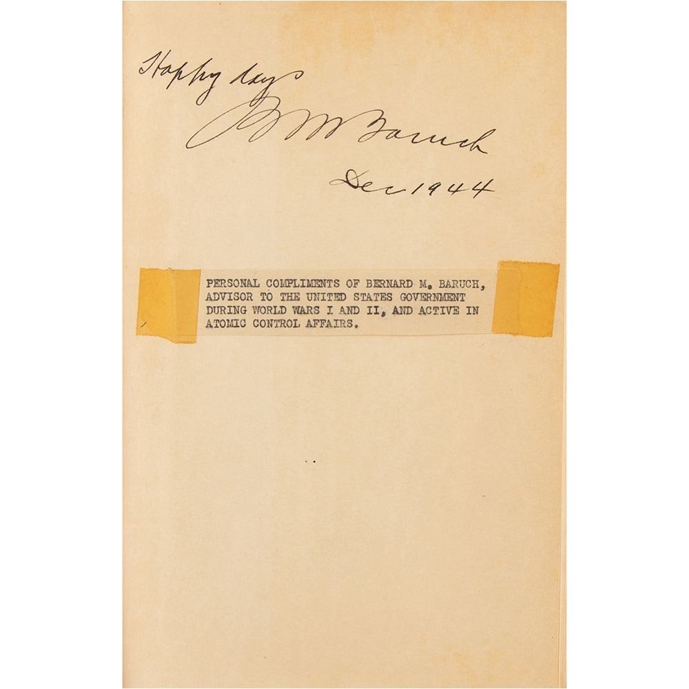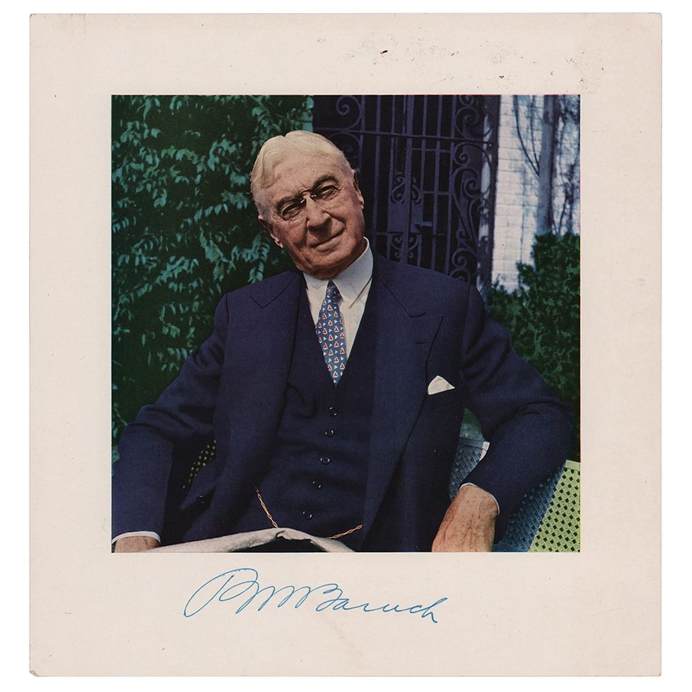 Two items: a color 9.5 x 10 book photo of the financier in a half-length pose, signed below in blue ink, “B. M. Baruch”; and a first edition of Bernard Baruch: Park Bench Statesman, hardcover with dust jacket, published by the Whittlesey House in 1944, signed on the first free end page in fountain pen, “Happy days, B. M. Baruch, Dec 1944.” In overall very good to fine condition, with heavy wear to the book's dust jacket, and light border creasing to the photo. Accompanied by two certificates of authenticity from JSA.