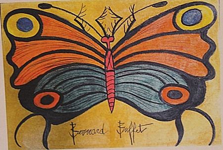 in the manner of Bernard Buffet "Butterfly II" pastel on paper circa.1971, private collection approx. 19x13in. Buffet was a painter well-known for his Expressionist works. Buffet was a member of L’Homme Témoin (the Witness-Man), an anti-abstract art group. Buffet was born in Paris, France, and he attended the École Nationale Supérieure des Beaux-Arts. Around the same time, Buffet also worked at the studio of Eugène Narbonne. As a struggling young artist, Buffet was supported by a French picture and art dealer while he was working on different works, portraits, still lifes, religious pieces, and landscapes.
