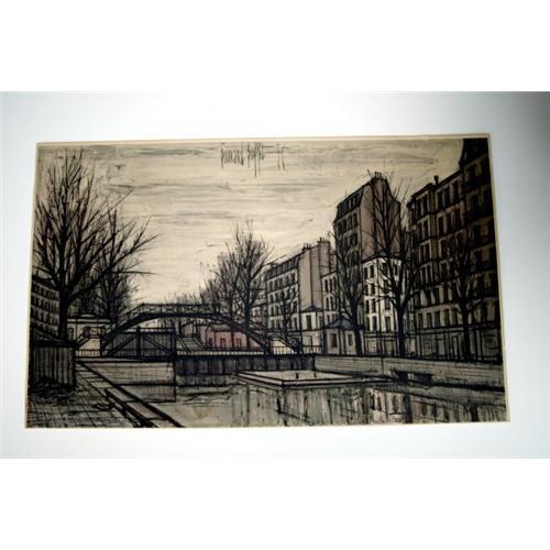Bernard Buffet colored print, signed in the print, Buffet '56. Condition: In the second picture you can see the small tear at the top. When its flat against glass, you have to look really close to see it. In one corner which is not pictured, a corner has a crease about a 1/4 inch from the point's corner edge. Again, when its flat against glass, it will be really difficult to notice. Buffet is well listed and even a print like this one is a nice addition to a collection.