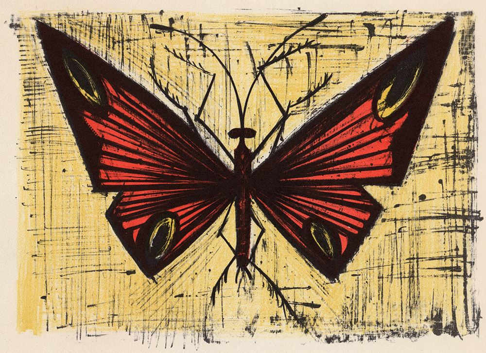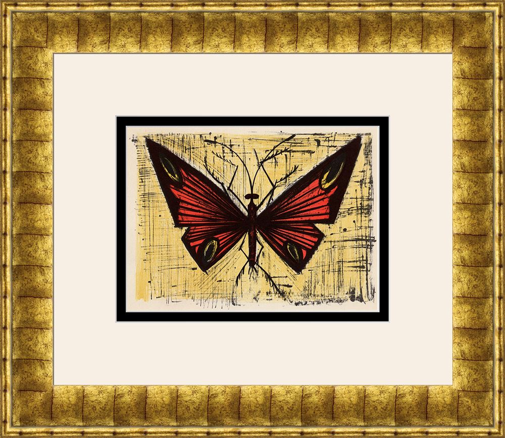 Buffet, Bernard "The Red and Yellow Butterfly" This color lithograph was pulled in Paris in 1967 by the legendary atelier Mourlot. Double matted and framed in a new moulding. Dimensions: Framed c. 14 x 16 inches. Accompanied by a Certificate of Authenticity.