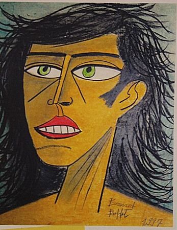 in the manner of Bernard Buffet "Self Portrait" pastel on paper circa.1997, private collection approx. 18x13in. Buffet was a painter well-known for his Expressionist works. Buffet was a member of L’Homme Témoin (the Witness-Man), an anti-abstract art group. Buffet was born in Paris, France, and he attended the École Nationale Supérieure des Beaux-Arts. Around the same time, Buffet also worked at the studio of Eugène Narbonne. As a struggling young artist, Buffet was supported by a French picture and art dealer while he was working on different works, portraits, still lifes, religious pieces, and landscapes.