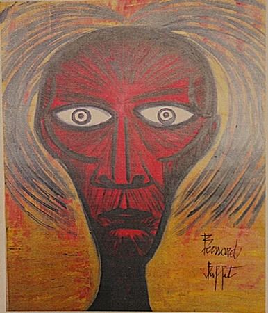 in the manner of Bernard Buffet "Untitled" oil on paper circa.1960, private collection approx. 11x16in. Buffet was a painter well-known for his Expressionist works. Buffet was a member of L’Homme Témoin (the Witness-Man), an anti-abstract art group. Buffet was born in Paris, France, and he attended the École Nationale Supérieure des Beaux-Arts. Around the same time, Buffet also worked at the studio of Eugène Narbonne. As a struggling young artist, Buffet was supported by a French picture and art dealer while he was working on different works, portraits, still lifes, religious pieces, and landscapes.