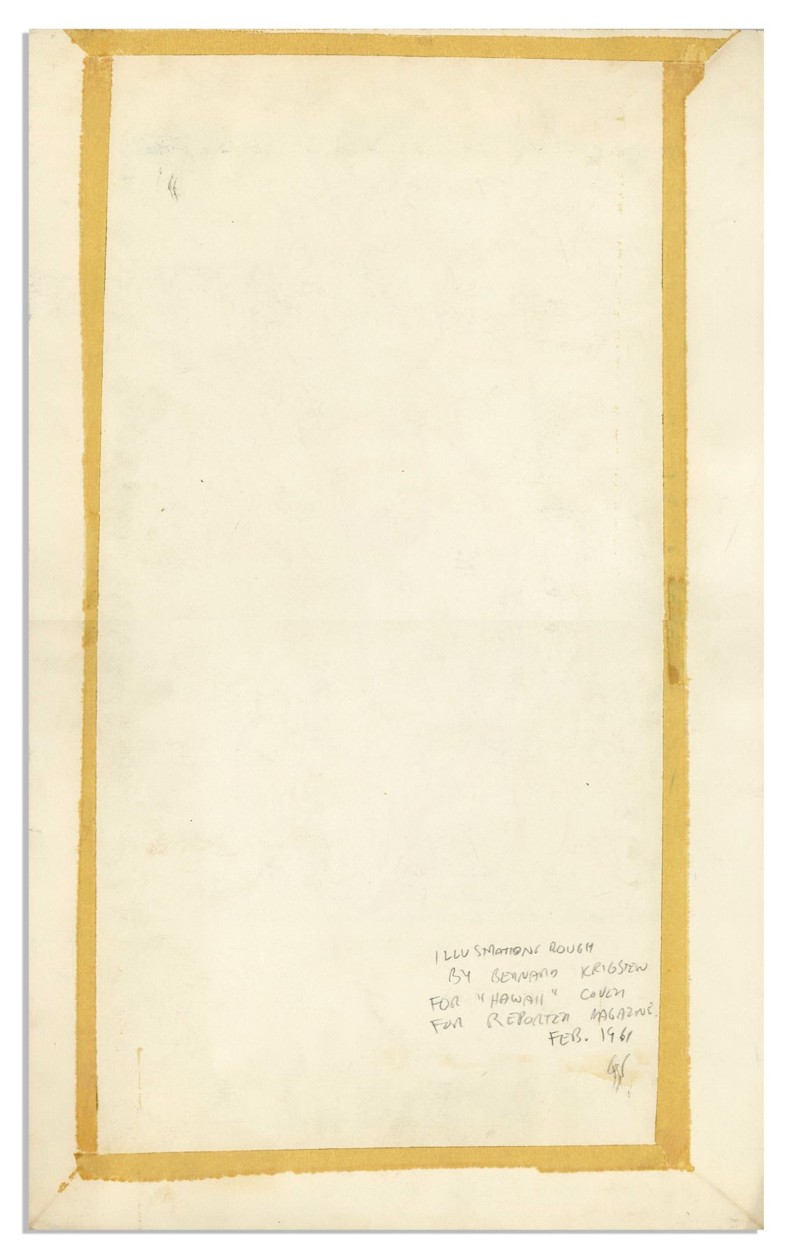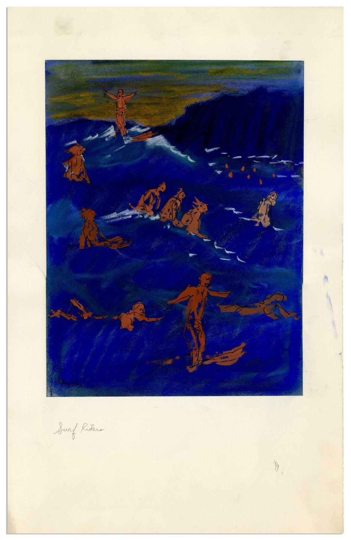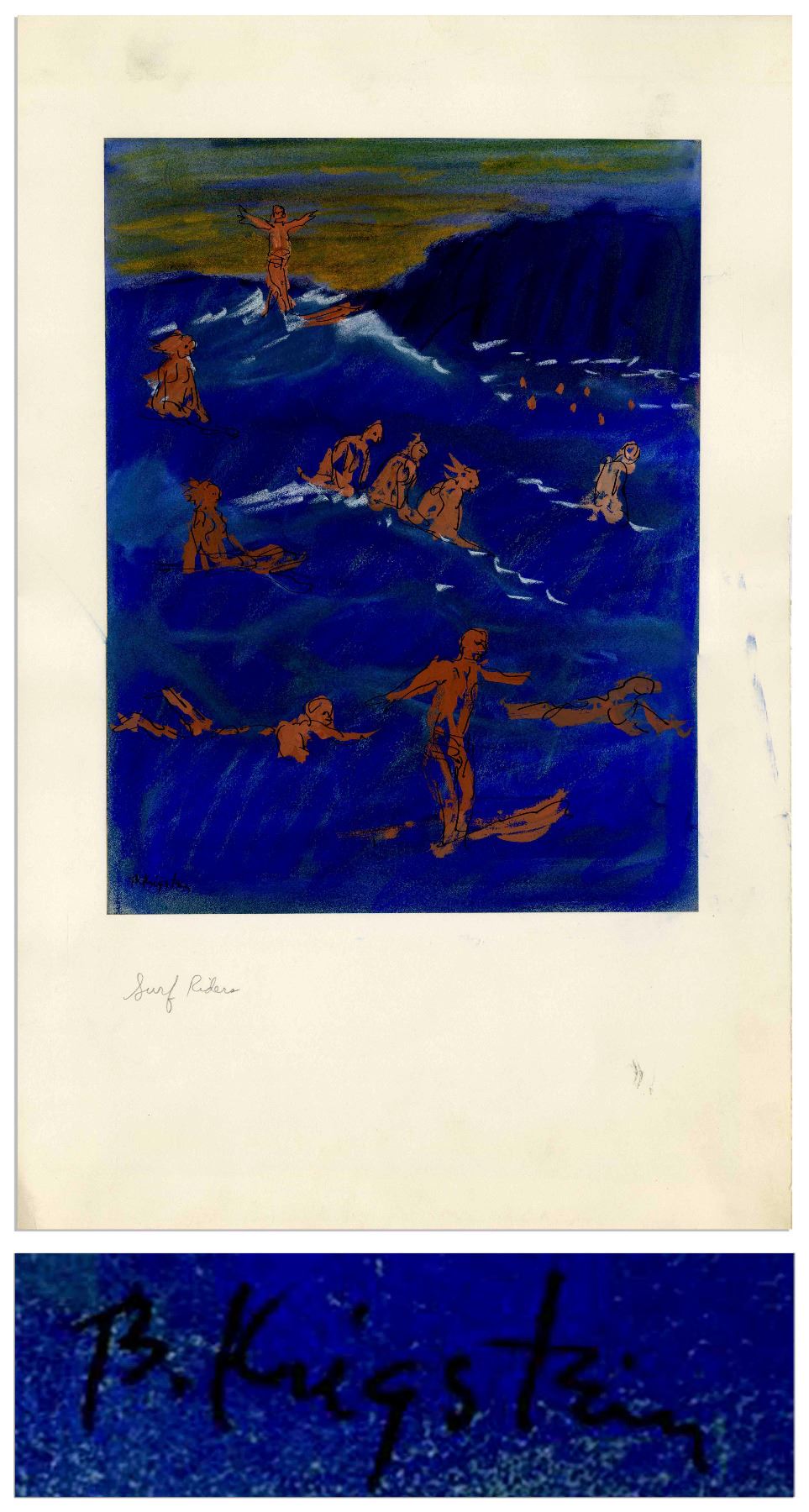 Bernard Krigstein signed illustration from February 1961, entitled ''Surf Riders'', done for the cover art of a Hawaii series for ''Reporter'' magazine. Large rough illustration measuring 10.5'' x 13.75'' is rendered in ink and pastel on paper, attached by Krigstein to illustration paper measuring 13.75'' x 22''. Signed ''B. Krigstein'' at lower left. Colorful, dramatic artwork has some smudging to margins, overall near fine.