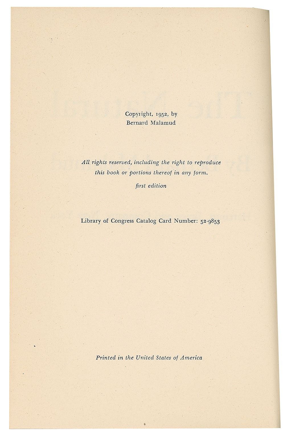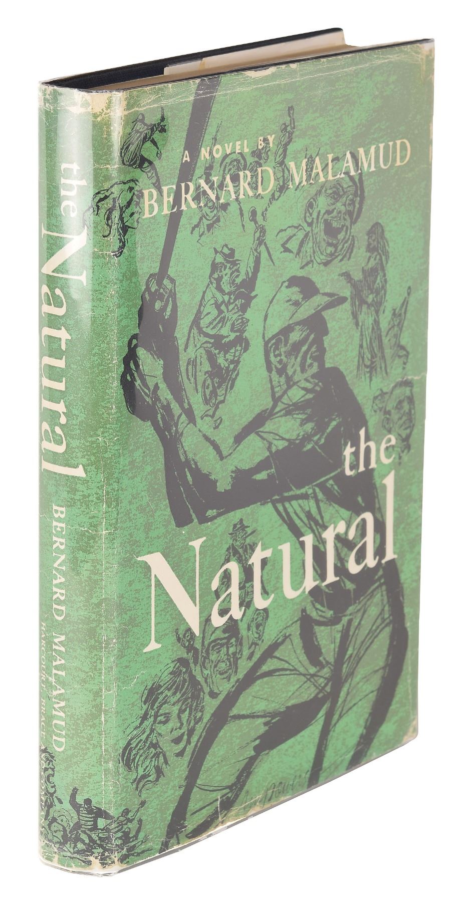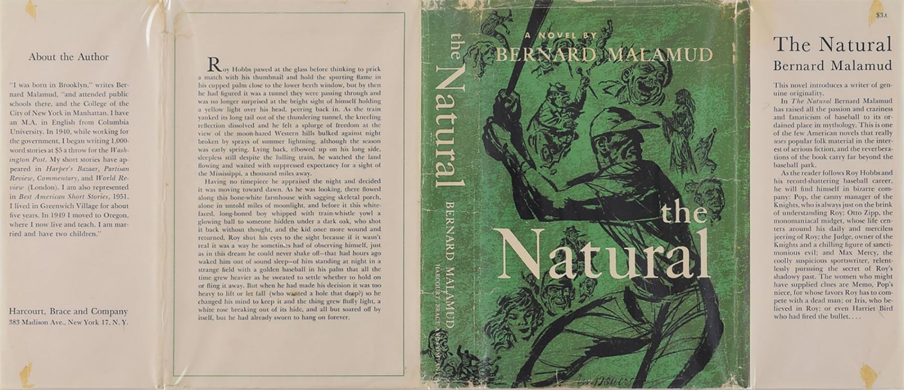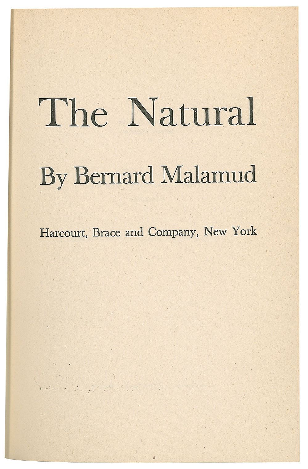 Unsigned first edition of Malamud's debut novel: The Natural. First edition. NY: Harcourt, Brace and Company, 1952. Hardcover with dust jacket, 5.5 x 8.25, 237 pages. Book condition: VG/VG, with some creasing, chipping, and small toned tape remnants to the clipped dust jacket, and some light staining and paper loss to the rear upper corner of the jacket. A desirable example of this classic baseball novel, which was famously adapted for the screen in 1984, starring Robert Redford as Roy Hobbs.