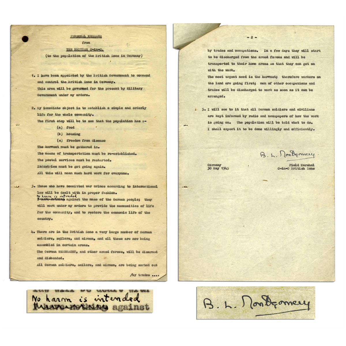 Exceptional, museum-worthy document signed by Bernard Montgomery as Commander-in-Chief of the British Zone in Germany, dated 30 May 1945, less than a month after the Germans surrendered and before the British Army of the Rhine had been formed. Headed ''Personal Message from The British C-in-C (to the population of the British Zone in Germany)'' and signed ''B.L. Montgomery'', with an autograph emendation in ink, where Montgomery crosses out the typed ''I have nothing against'' the German people and alters it in his hand to: ''No harm is intended'' against the German people. Two page document, labeled ''Top Secret'' at head reads in part, ''1. I have been appointed by the British Government to command and control the British Zone in Germany. This area will be governed for the present by Military Government under my orders…2. The first step will be to see that the population has (a) food (b) housing (c) freedom from disease. The harvest must be gathered in…3. Those who have committed war crimes according to international law will be dealt with in proper fashion. No harm is intended against the mass of the German people; they will work under my orders to provide the necessities of life for the community…4. The German Wehrmacht, and other armed forces, will be disarmed and disbanded. All German soldiers, sailors, and airmen, are being sorted out by trades and occupations…5. I will see to it that all German soldiers and civilians are kept informed by radio and newspapers of how the work is going on. The population will be told what to do. I shall expect it to be done willingly and efficiently…'' File tack to upper left is rusted and minor creasing throughout. Measures approximately 14.25'' x 10'', in very good condition.
