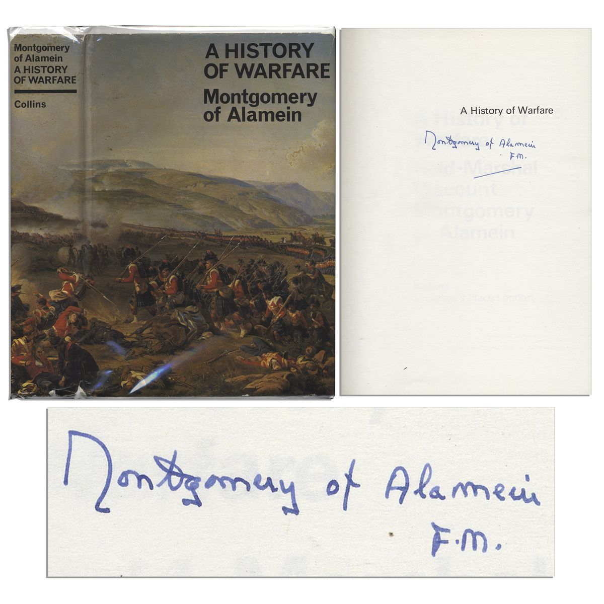 Bernard Montgomery signed first edition of ''A History of Warfare''. Published by Harper Collins: London: 1968. The author signs upon the fly-leaf: ''Montgomery of Alamein F.M. [Field Marshal]'' The illustrated history spans ancient warfare to the nuclear age. Montgomery, British commander of Allied ground troops at Normandy, states in his preface: ''The aim of the general must be not only to win wars but also to play his part in preventing them.'' 7'' x 10'' book runs 584pp., bound in red linen boards and lettered in gold. Very good condition.