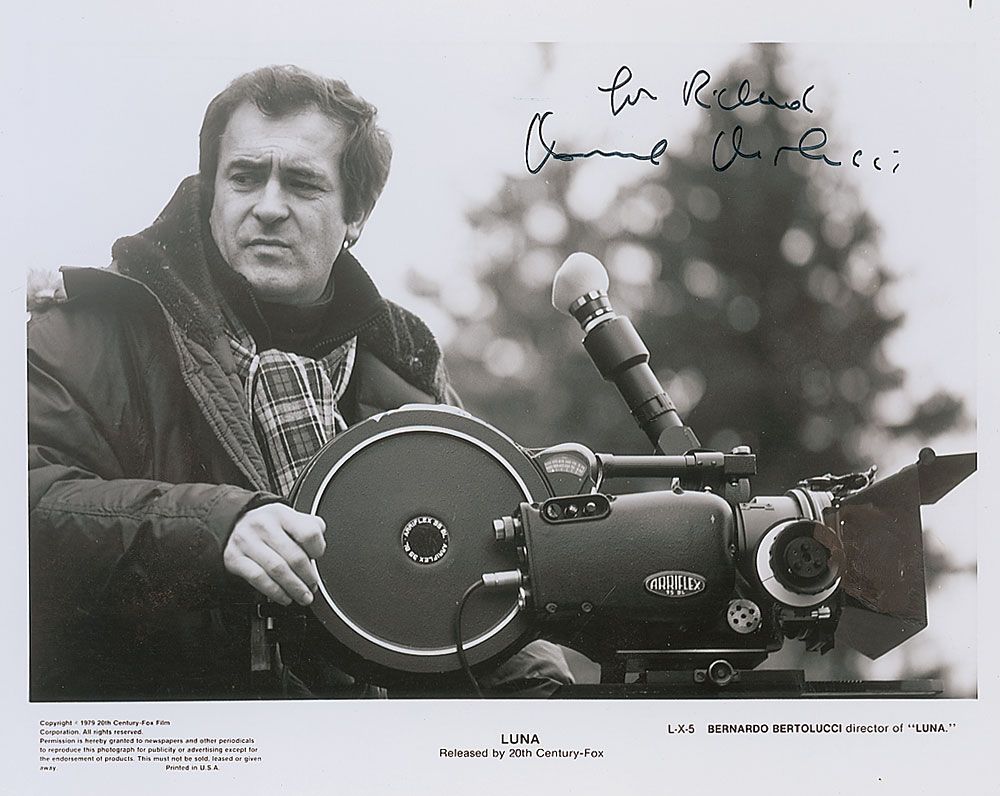 Glossy 10 x 8 promotional photo of Bertolucci shooting Luna, signed and inscribed in black felt tip, “For Richard, Bernardo Bertolucci.” In fine condition, with a small crease to the right of his head.