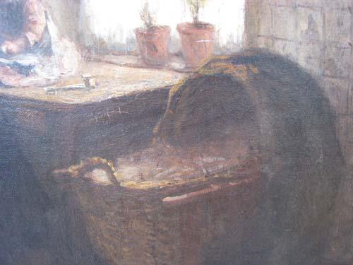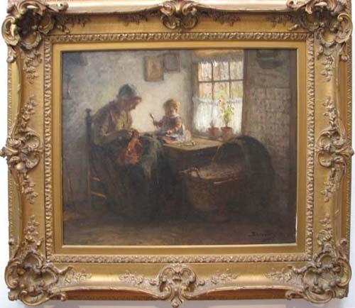 Description: A beautifully painted Genre of the Interior of a Dutch Cottage with Mother and Baby
