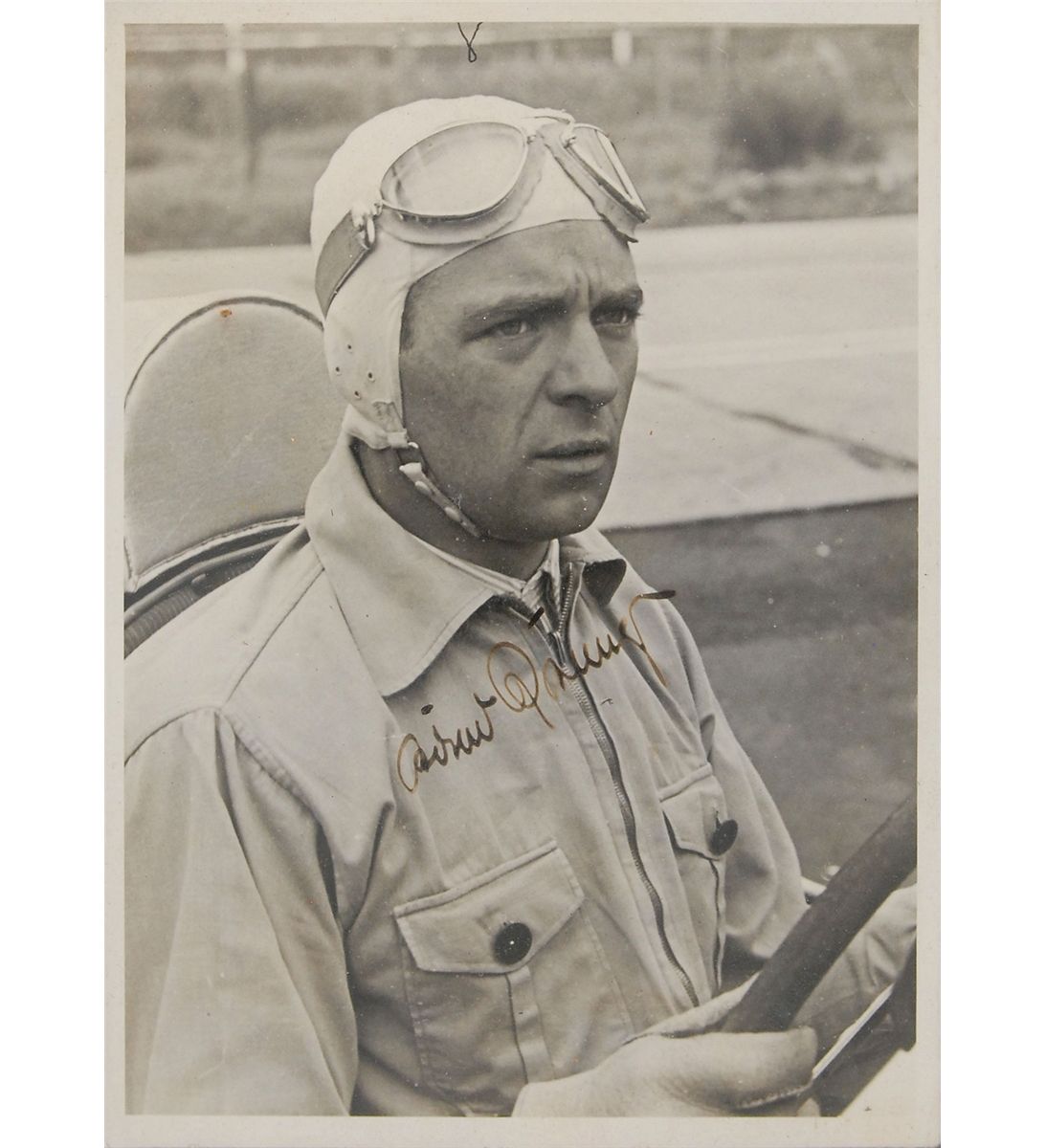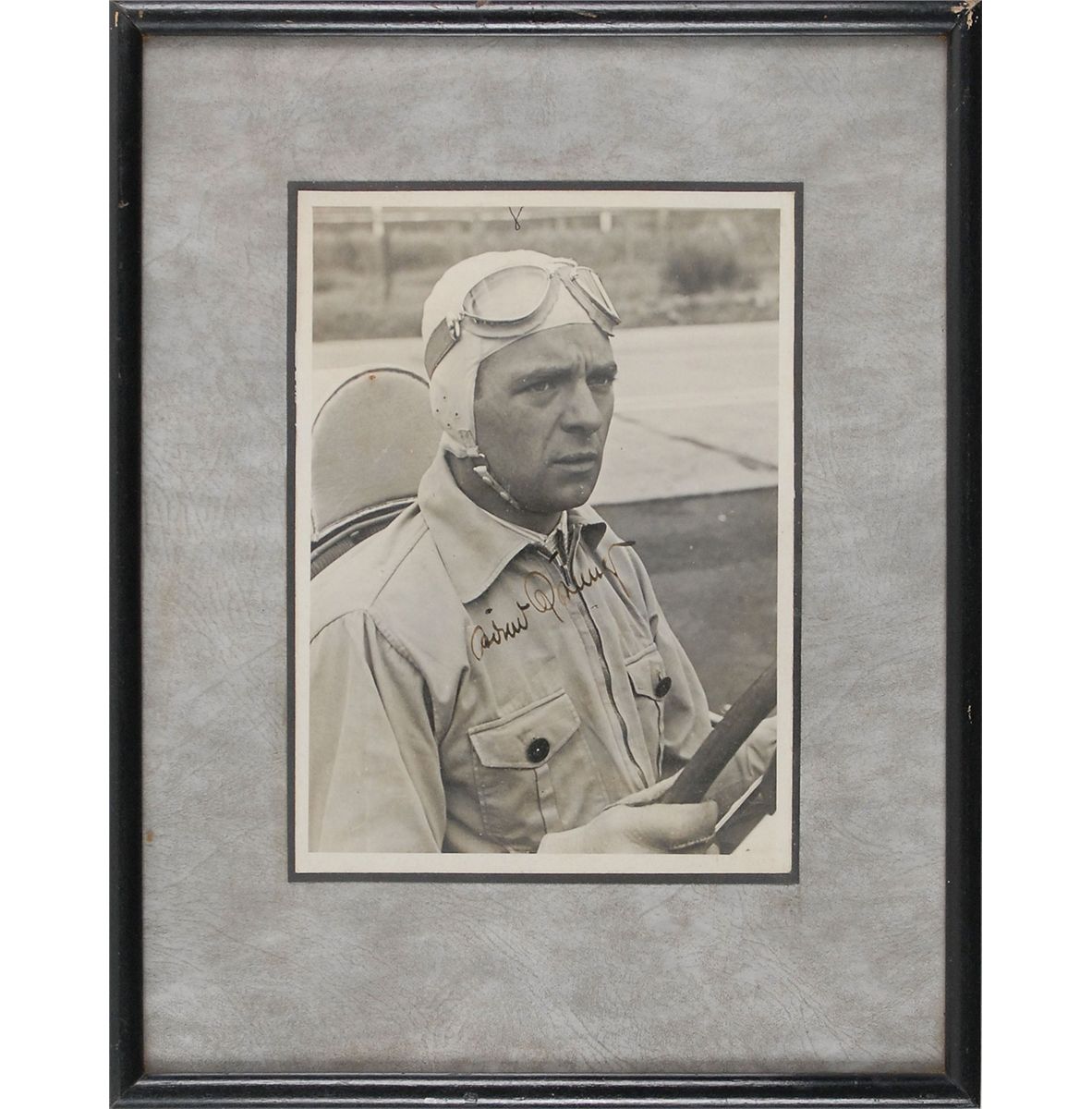 German racing driver (1909–1938) who was killed while trying to set a land speed record on the Autobahn. Scarce vintage glossy 5 x 7 half-length portrait of Rosemeyer seated in his race car, signed in fountain pen. Affixed to an 8.25 x 10.5 mount and framed to an overall size of 9 x 11.5. In fine condition.