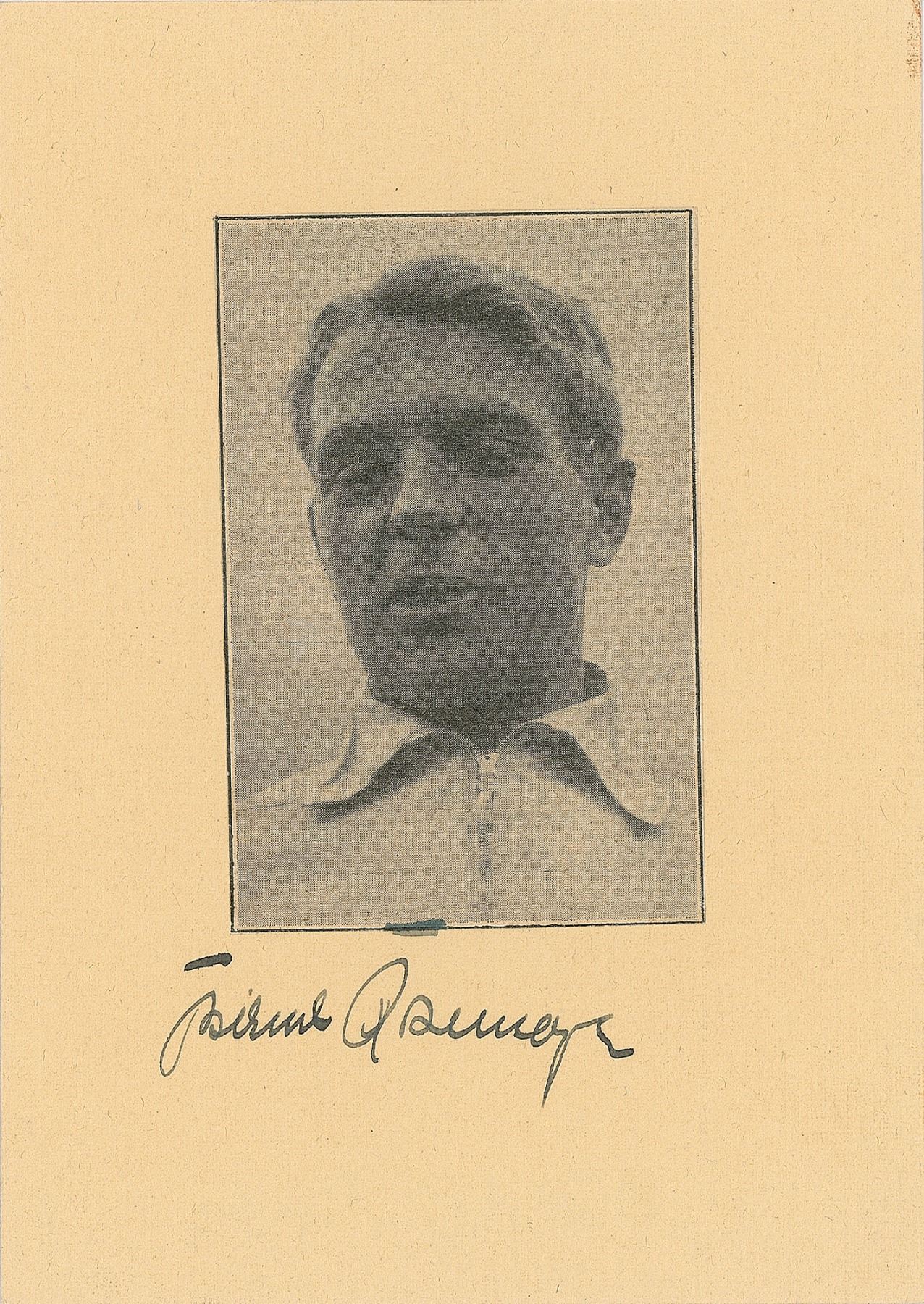 German racing driver (1909–1938) who was killed while trying to set a land speed record on the Autobahn. Bold vintage fountain pen signature, "Bernd Rosemeyer,” on an off-white 4 x 5.75 card bearing an affixed newspaper portrait. In very fine condition.