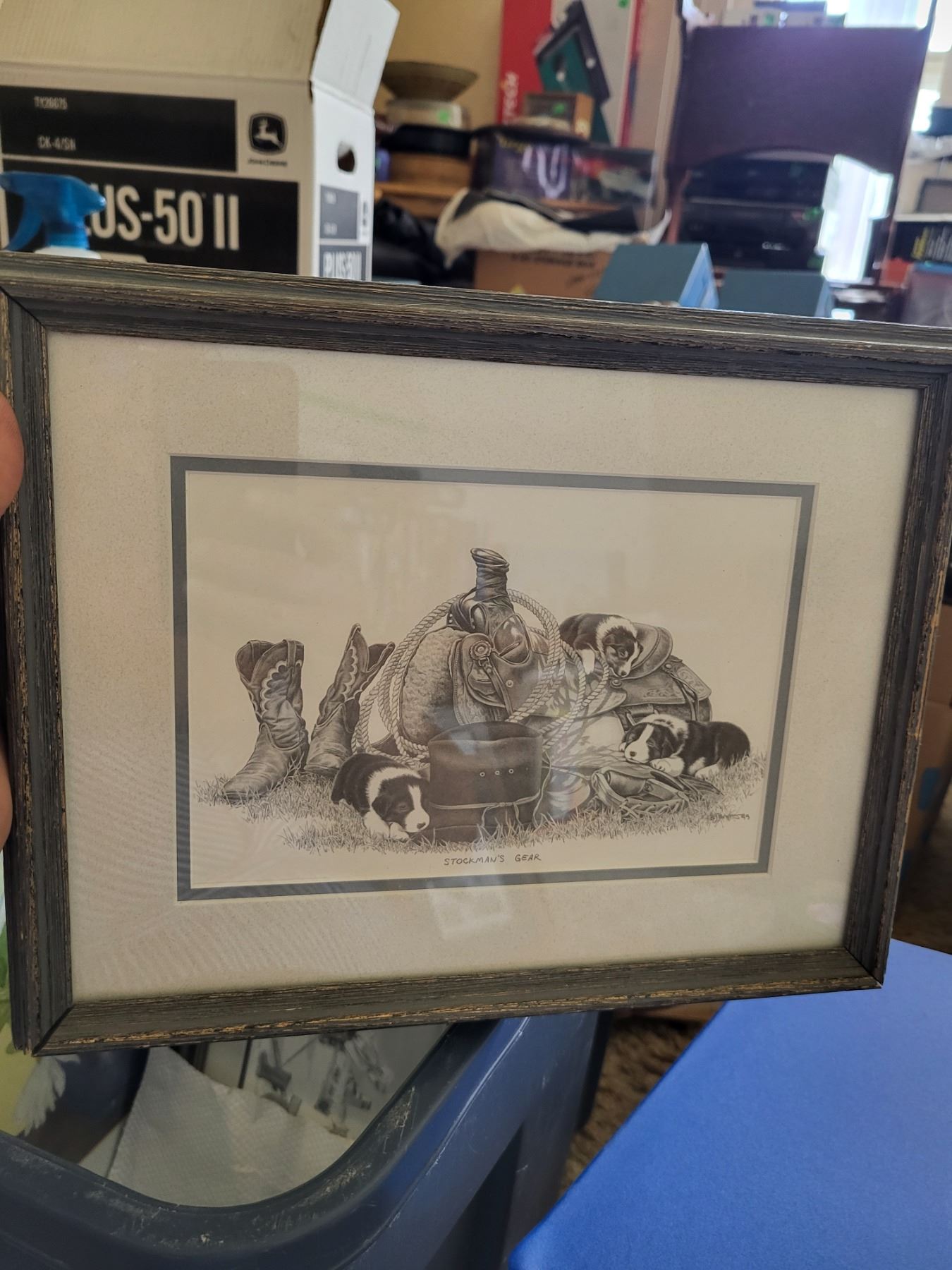 Bernie Brown "Stockman's Gear" Framed and Matted. Measures 11.75x9.75"