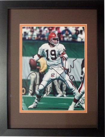 In 1990 and 1991, Bernie Kosar set a league record by throwing 308 consecutive passes without an interception (a record since surpassed by New England Patriots quarterback Tom Brady on December 26, 2010 against the Buffalo Bills). 1987 was Kosar's finest year, statistically. In the strike-shortened season, he completed 62 percent of his passes for 3,033 yards and 22 touchdowns and led the AFC in quarterback rating. Bernie Kosar has hand autographed this Cleveland Browns 8x10 Photo. Custom Brown and Orange Mat and Premium Black Frame as shown. Certificate of Authenticity from Athlon Sports Collectibles.