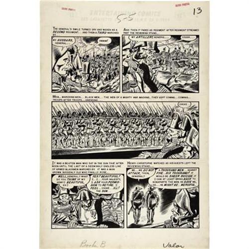<B>Bernie Krigstein - Valor #1, "Strategy" page 5 Original Art (EC, 1955).</B></I> <BR> One of the most respected artists from the world-class EC line-up, Bernie Krigstein was a master craftsman at the top of his form when the psychological thriller, "Strategy," was published. EC was under fire by the newly created Comics Code Authority, and this page spotlights Krigstein's remarkable storytelling and draftsmanship. This piece has an image area that measures approximately 13" x 18", and the art is in Excellent condition. A magnificent page from one of comics' greatest artists, this piece is sure to be a welcome addition to any EC art collection. <BR><BR><b>Shipping:</b> Flat Material, Small (<a target="_blank" href="http://www.heritageauctions.com/common/shipping.php">view shipping information</a>)