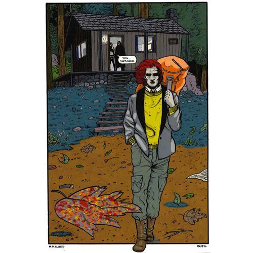 <B>Bernie Mireault and Mike Allred - The Everyman Splash Page 48 Original Art (Marvel, 1991).</B></I> This image was created in a different manner than traditional comic book procedures. Using a transparency made from Michael Allred's line art, Bernie Mireault painted his rich colors directly on the reverse side of the transparency, in the manner of an animation cel. This resulted in a vivid color image that is far more striking than the usual "blue line" color technique would allow. The image area of this piece measures 6" x 9", and the art is in Excellent condition.
