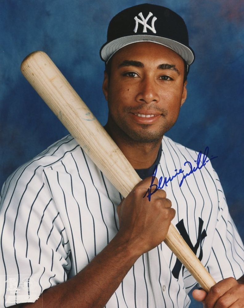 8x10 photo. Hand-signed in blue felt-tip pen by Bernie Williams. Autograph includes an authenticity guarantee and LOA from Pristine Auction.