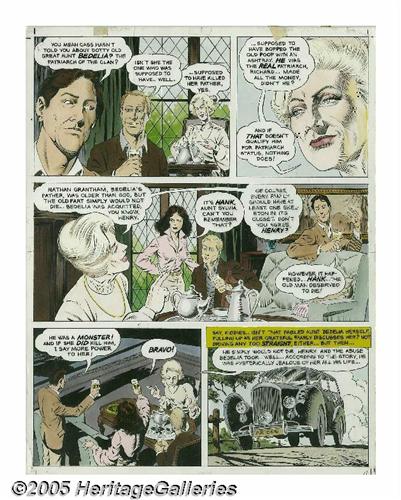 <B>Bernie Wrightson - Creepshow, page 4 Original Art (Signet, 1982).</B></I> "Creepshow" was a chilling collaboration between horror masters Stephen King and George A. Romero, so naturally when producing a comic book based on the film, they turned to the modern master of comic book horror, Bernie Wrightson, with spectacular results. This page, from the first segment "Father's Day," details the family telling their newest member, Hank, the legend of Great Aunt Bedelia, who killer her father and got away with it. Wrightson's gorgeous linework and vivid color make this page something special. The image area measures 12.5" x 16" and the artwork is in Excellent condition, with an acetate overlay containing the lettering.