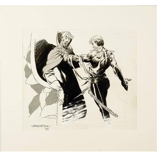 In this hard-hitting rendition of Flash Gordon by pen and ink master Bernie Wrightson, Ming the Merciless finally gets the butt-whupping he so richly deserves! This super-spectacular most likely was printed in a fanzine. This drawing has been professionally framed to an overall size of 18.5" x 17", and the art is in Excellent condition.<BR><BR><b>Shipping:</b> Framed (<a target="_blank" href="http://www.heritageauctions.com/common/shipping.php">view shipping information</a>)