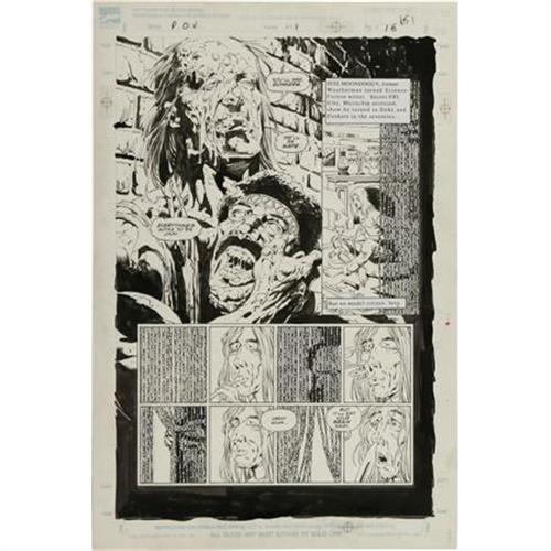 <B>Bernie Wrightson - Punisher: P.O.V. #1, page 16 Original Art (Marvel, 1991).</B></I> Hard-boiled writer Jim Starlin and famed horror artist Bernie Wrightson, the same creative duo that created a fan sensation with their work on the <B>Batman: The Cult</B></I> series for DC, teamed again to create a cutting-edge mini-series for Marvel. "It's kind of an odd Punisher story." That's how writer Jim Starlin described <B>Punisher: P.O.V.</B></I>, a tale about a psychotic killer who has hallucinations that he's hunting down monsters. This blood-chilling scene from "And None Shall Live" features a sly entrance by the Punisher in the last few panels. Remember, just say no to drugs! This page has an image area of 11.5" x 17.5", and the art is in Excellent condition. <I> From the Studio Collection of Bernie Wrightson.</B></I><BR><BR><b>Shipping:</b> Flat Material, Small (<a target="_blank" href="http://www.heritageauctions.com/common/shipping.php">view shipping information</a>)