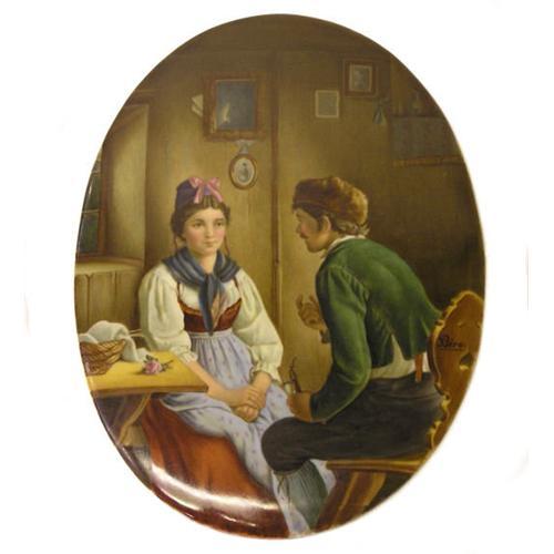 This lovely nineteenth century KPM plaque, signed Bero, depicts a young man courting a young woman. It measures 6" high and 4" wide and carries the impressed KPM sceptre mark. This item comes from a family who have been collecting European porcelain for four generations. It resides on the Upper East Side of Manhattan in New York and may be seen by appointment.
