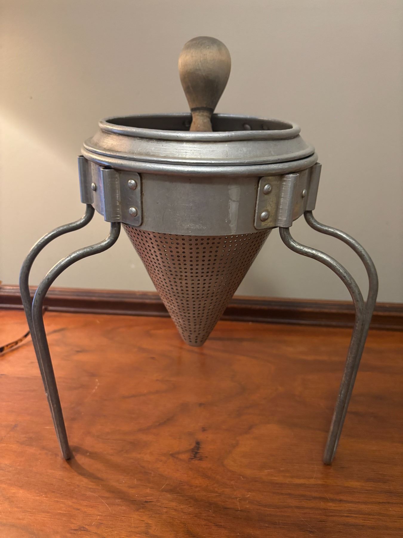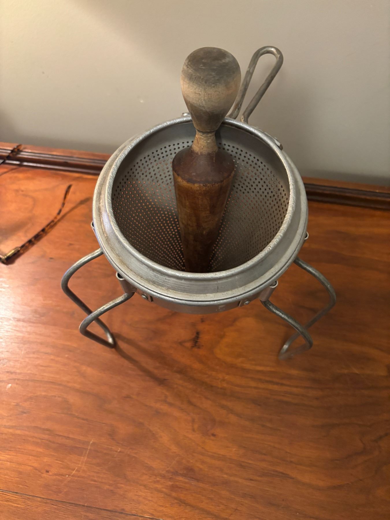 Aluminum strainer, wood pestle, 10” high x 10” wide (legs)