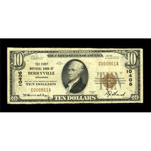<B>Berryville, AR</B></I> - $10 1929 Ty. 1 <B>The First NB</B></I> Ch. # 10406<BR> A neat town name which may relate to the main industry is noticed on this pleasing <B>Very Good</B></I> note.<B></B></I><BR><I>From The Kansas City Collection.</B></I><BR><BR><b>Shipping:</b> Coins & Currency (<a target="_blank" href="http://www.heritageauctions.com/common/shipping.php">view shipping information</a>)