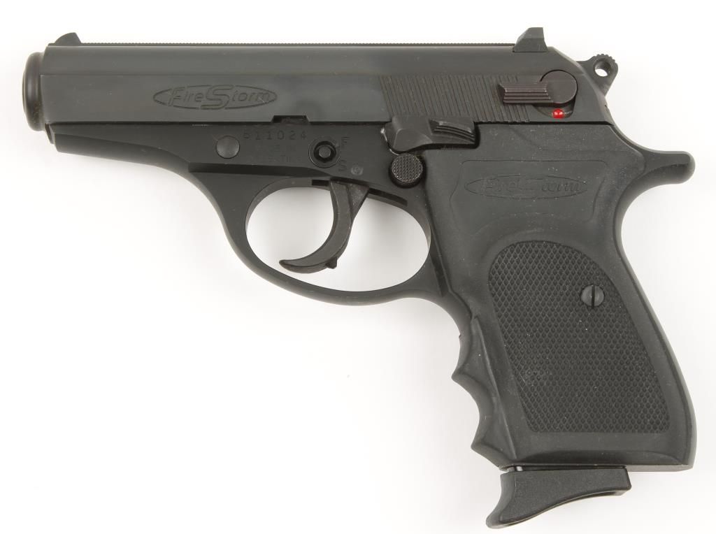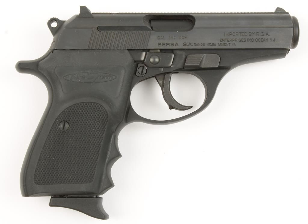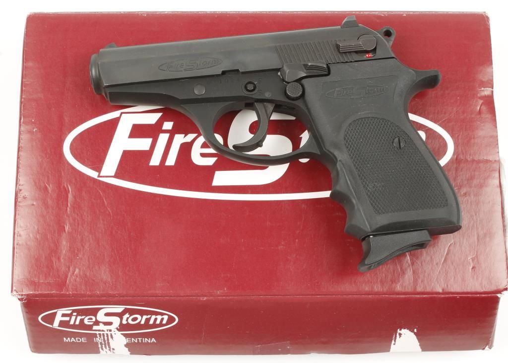 Double action semi auto pistol made in Argentina. Black finish, checkered rubber grips, 3-1/2" barrel, white outline rear sight and decocking lever. Good bore and action. Includes original box, manual and 1 magazine. Condition: Very good to excellent showing light use.