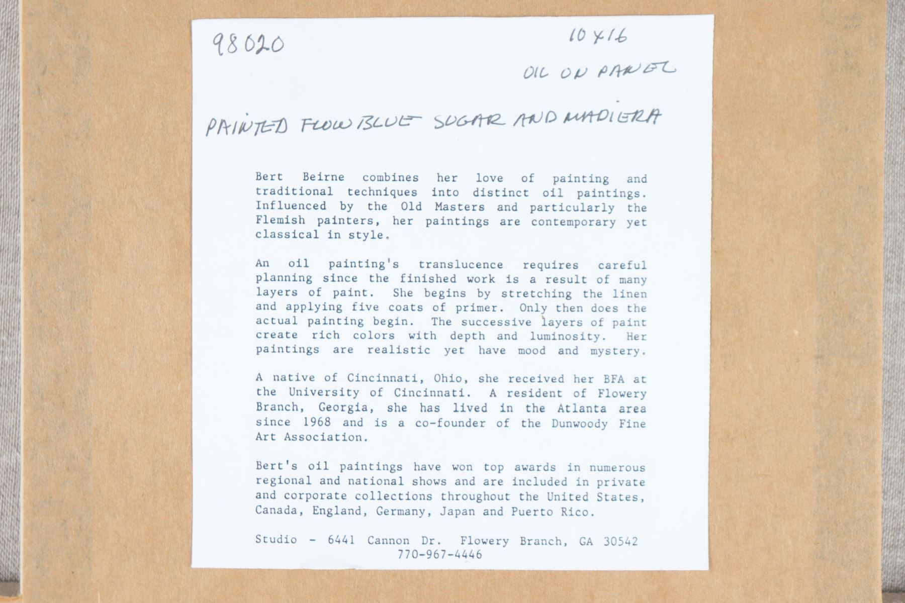 "Painted Flow Blue Sugar and Madiera", oil on panel, framed.