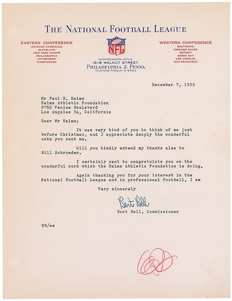 Commissioner of the NFL; his television policies of home team blackouts and one-league, one-network led to NFL’s financial growth. He also coined the phrase, ‘On any given Sunday, any team can beat any other team.’ TLS, one page, 8.5 x 11, National Football League letterhead, December 7, 1955. Letter to Paul Helms of the Helms Athletic Foundation. In part: “I certainly want to congratulate you on the wonderful work which the Helms Athletic Foundation is doing. Again thanking you for your interest in the National Football League and in professional football.” In fine condition, with horizontal fold through signature, red pencil mark to bottom portion, and a bit of mild toning. A scarce offering from one of football’s great leaders who guided the league to new heights in popularity.